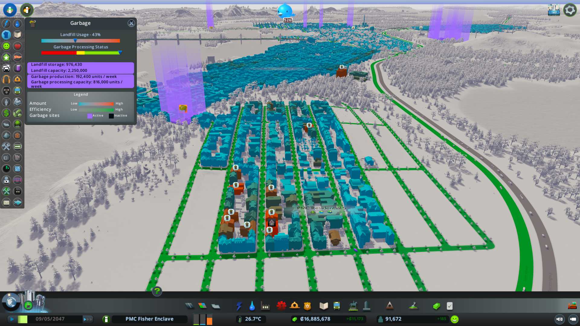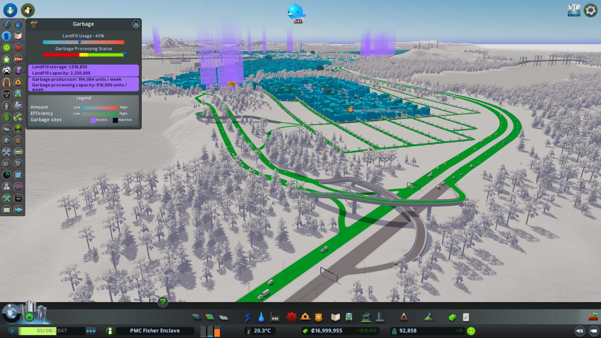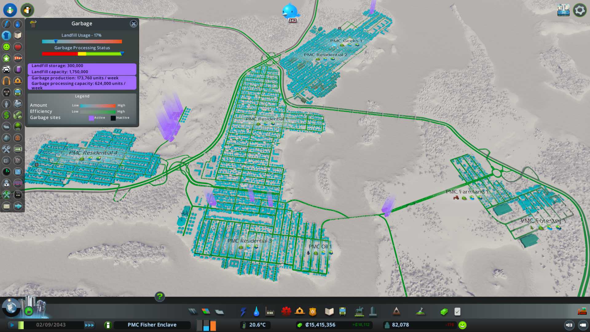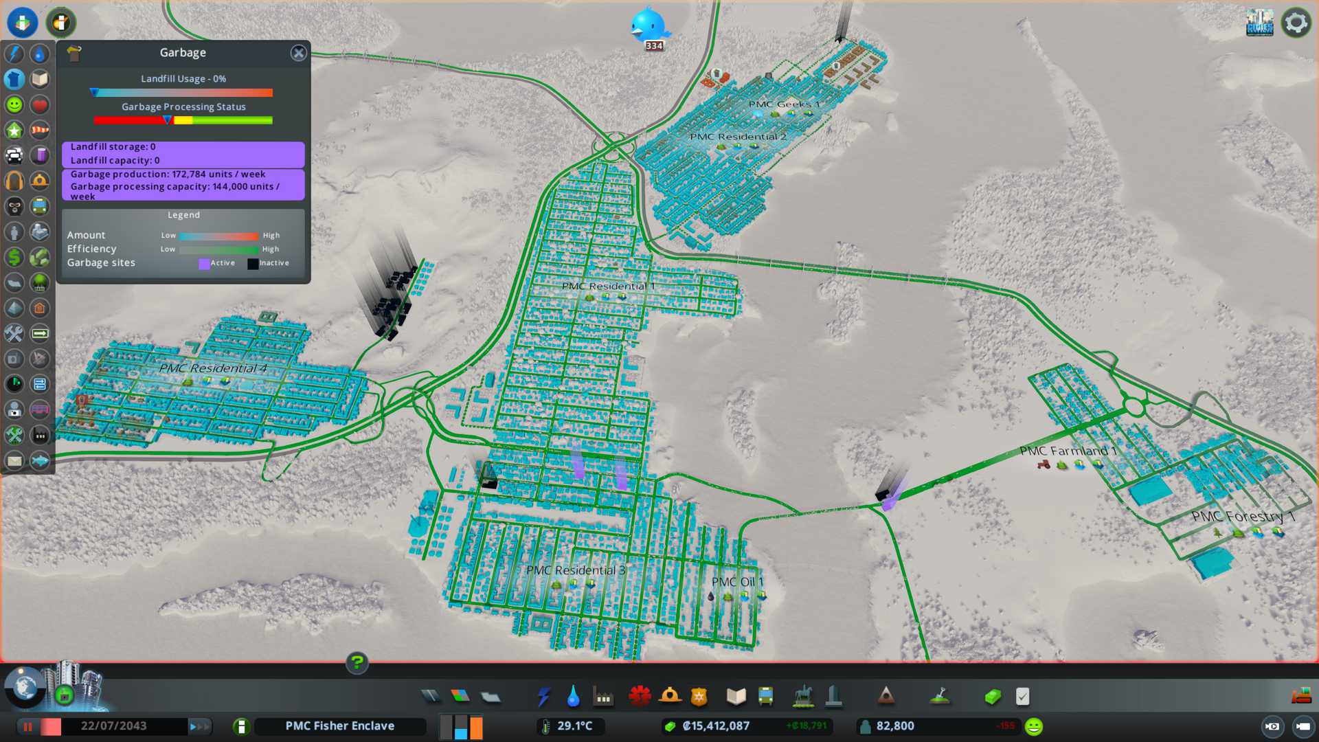 2022-08-14T08:43:00Z Garbage status, black buildings are the new ones I just placed. Big ones are the waste processing complexes and smaller waste transfer facilities. Lake bottom also has two incineration plants and advanced inland water treatment plants.