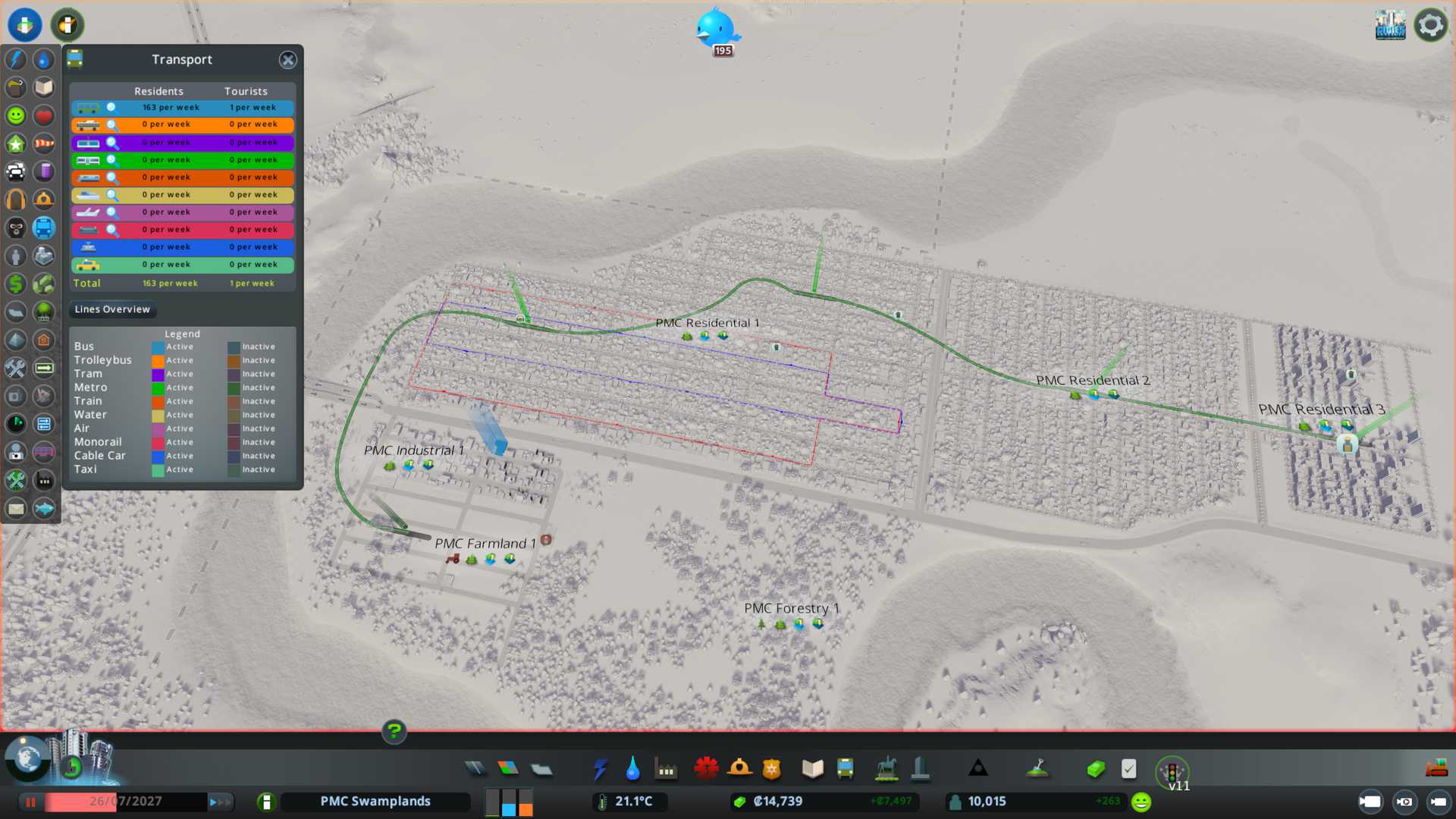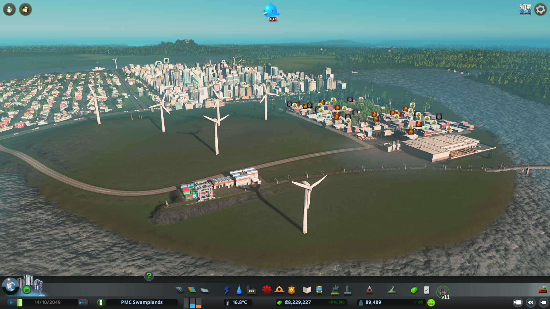 Started the day off by adding bunch of office zone 4 x 4 unit areas by PMC Residential 3 district. So far had good luck with available workers. Demand for industrial / offices (or jobs) is about 80% now.