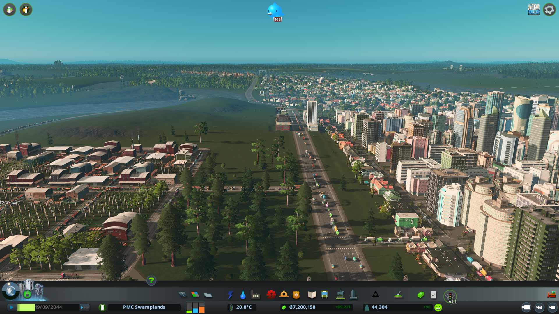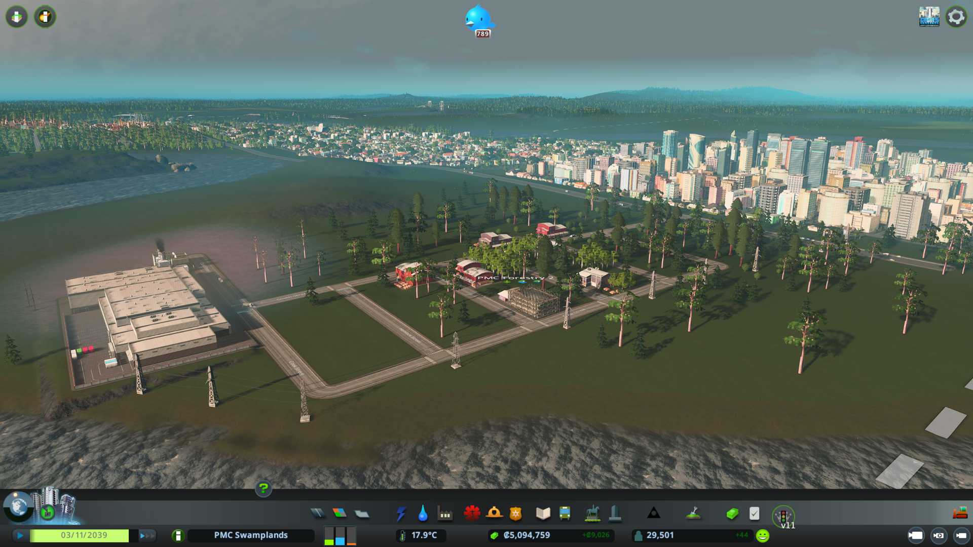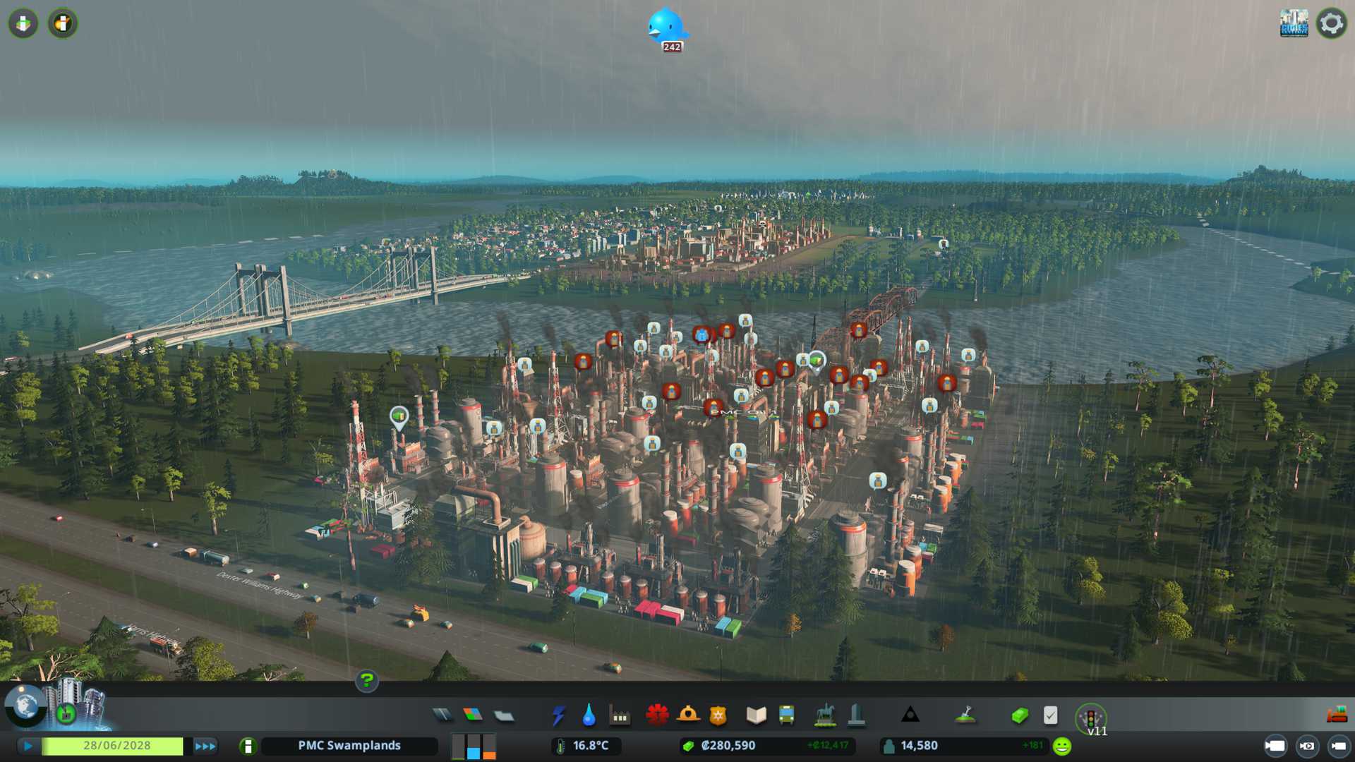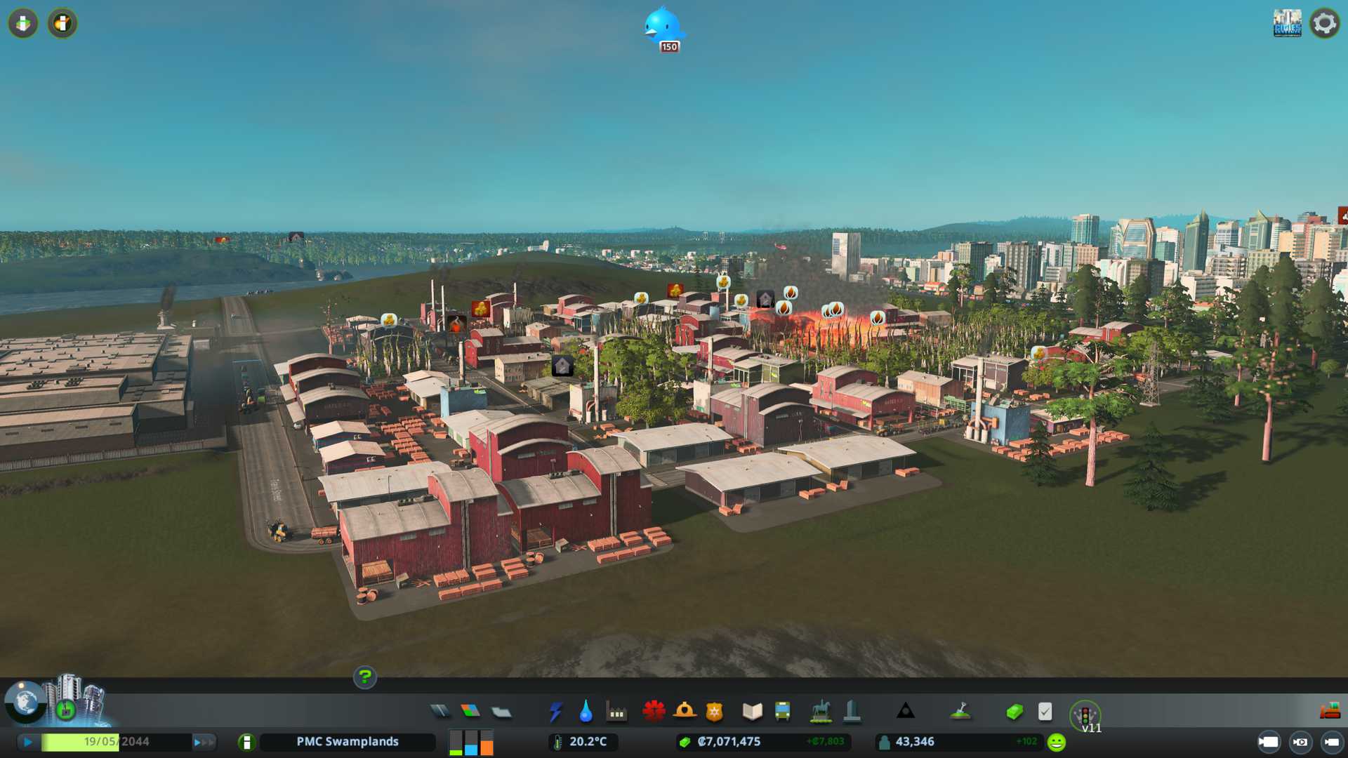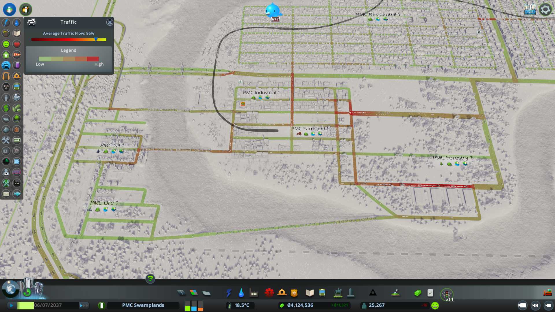 Created PMC Forestry 2 district by the south end of our city, nicely connected to arterial six lane road, I want to see what kind of effect this location gives on such big road. Also have that 750k capacity warehouse storing "zoned industry - forestry products" for us.