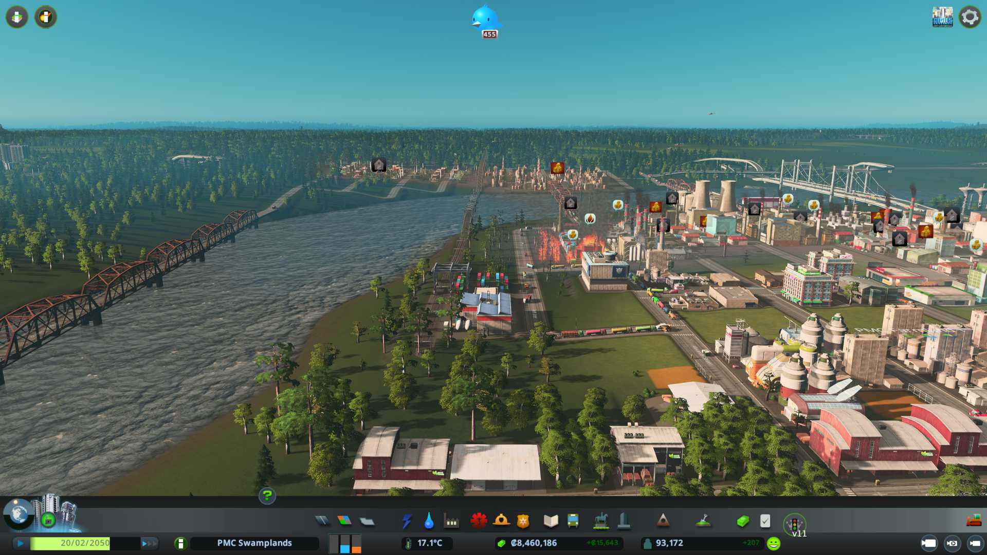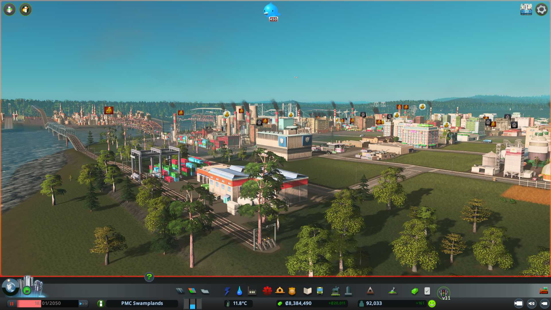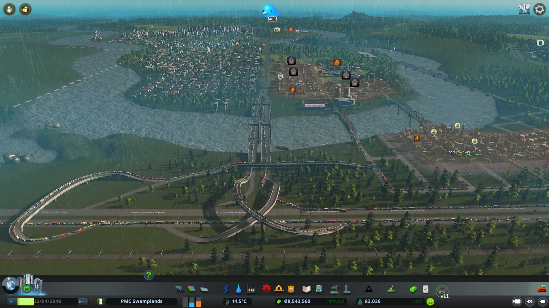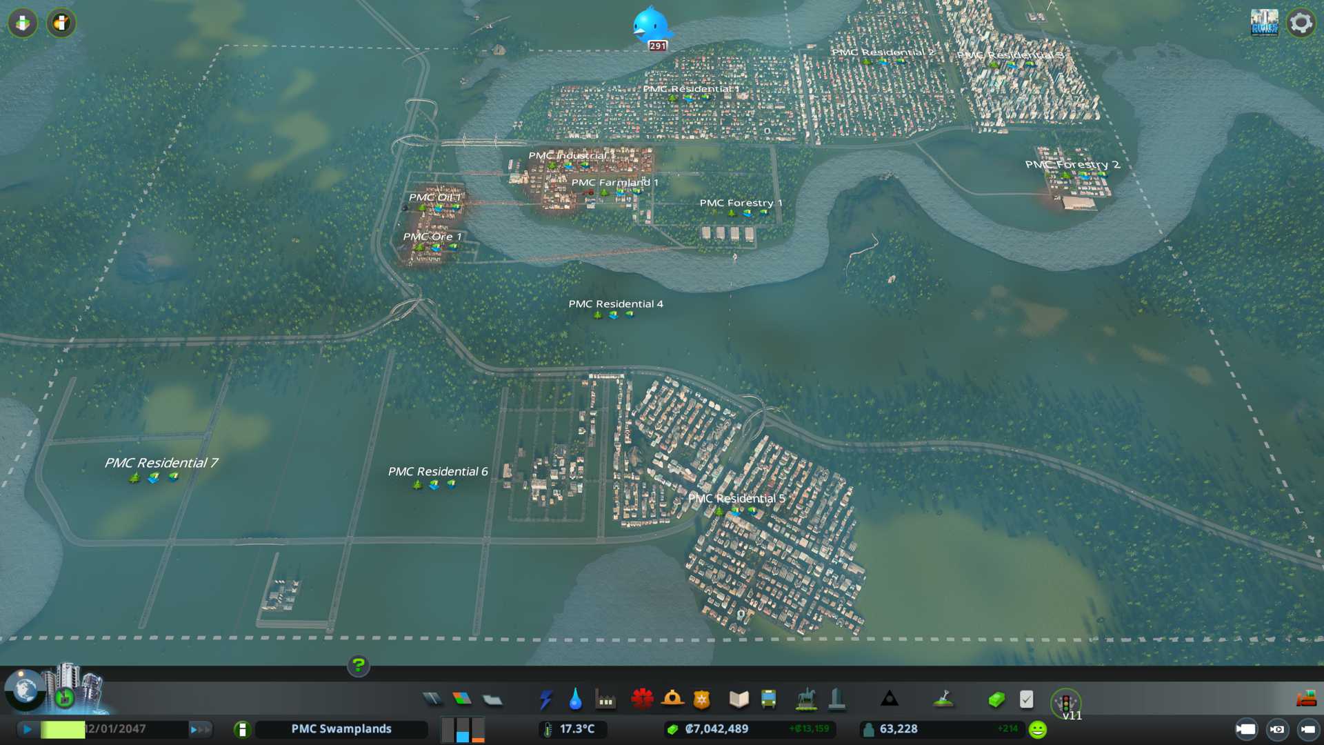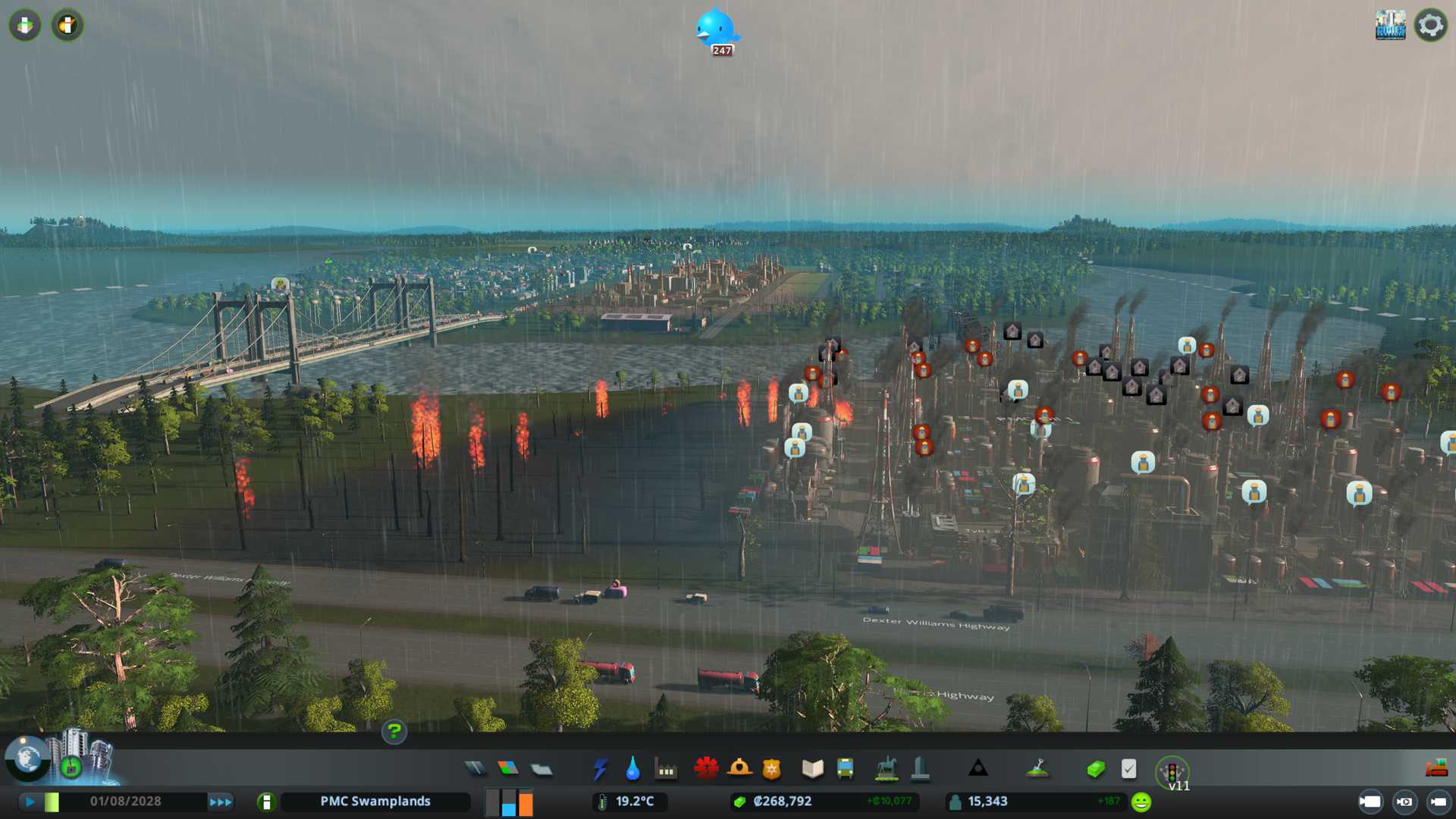 Created PMC Forestry 2 district by the south end of our city, nicely connected to arterial six lane road, I want to see what kind of effect this location gives on such big road. Also have that 750k capacity warehouse storing "zoned industry - forestry products" for us.