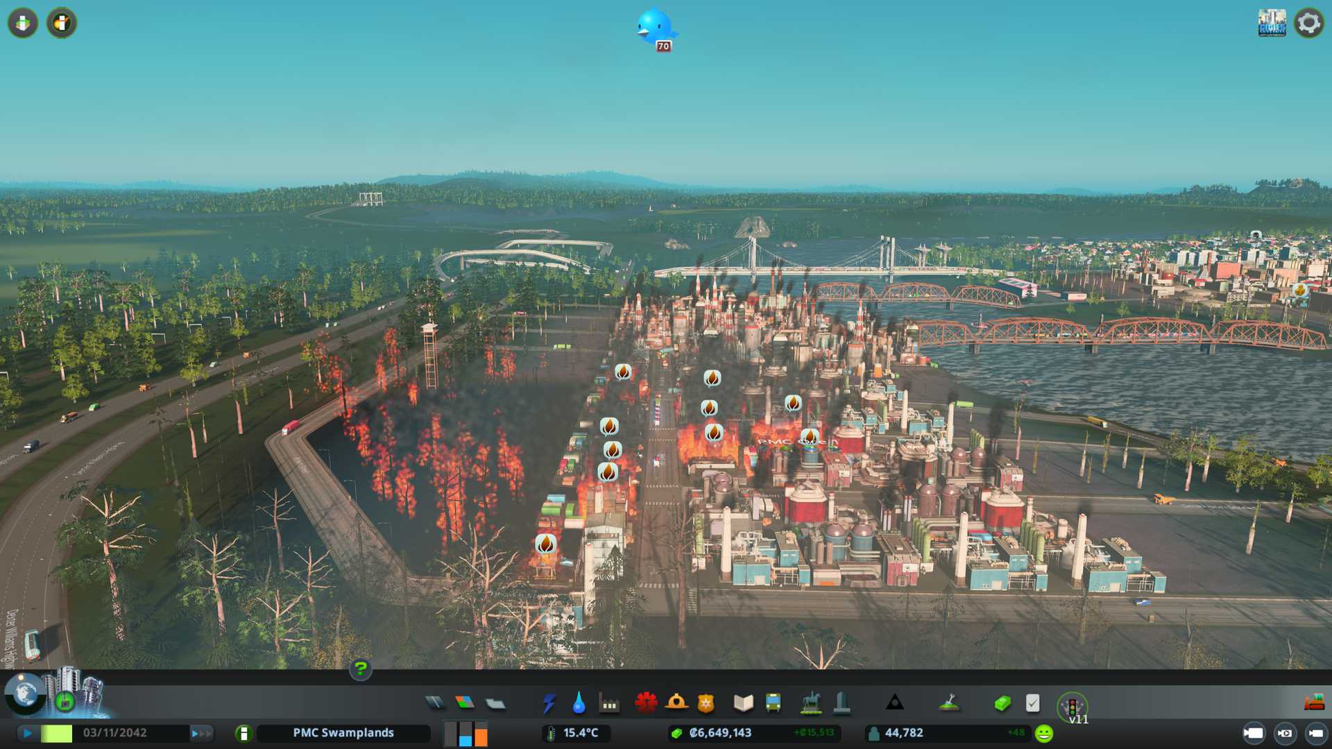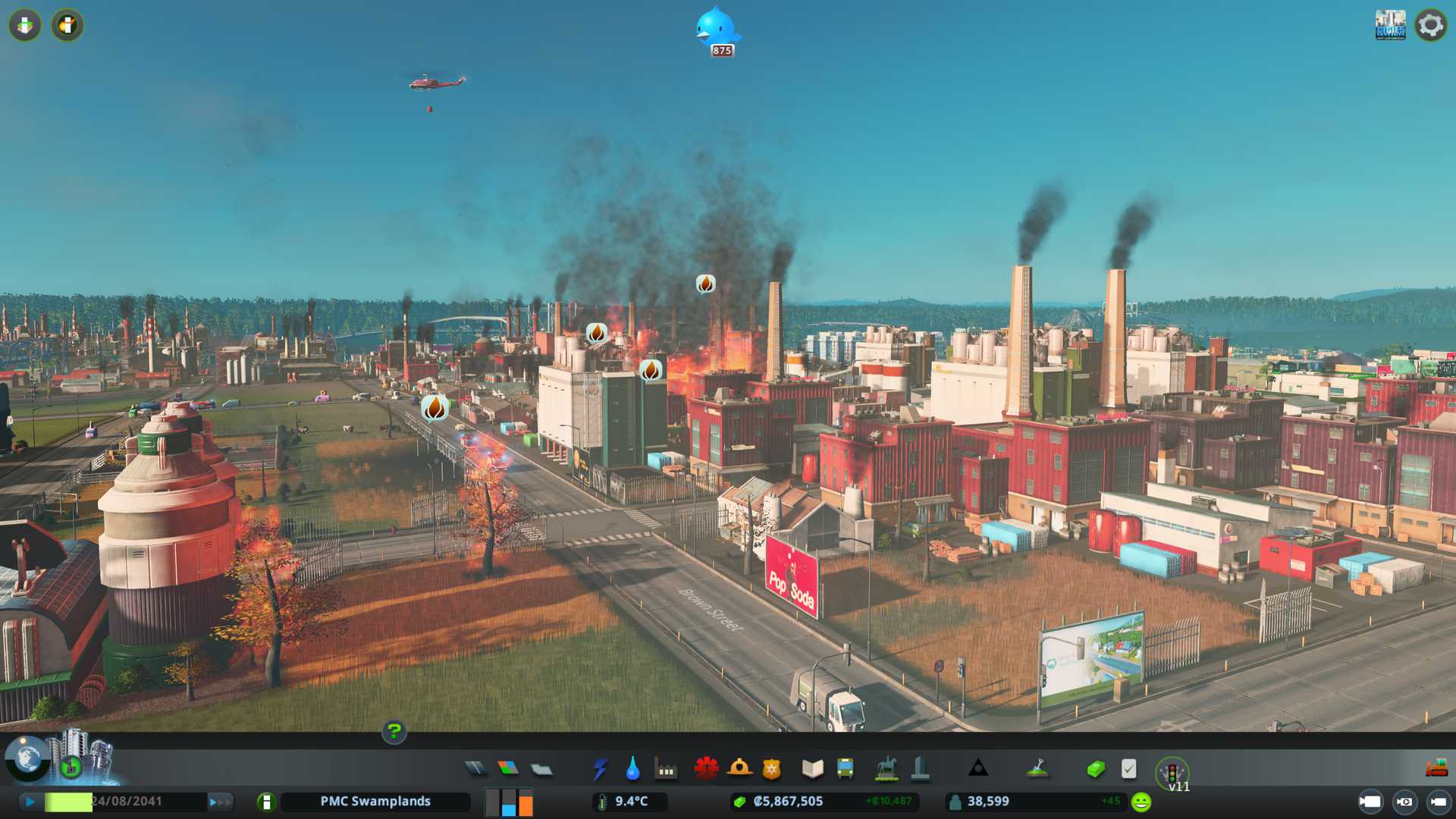 But we did suffer one destroyed building even though 6 fire engines (fire trucks) reached the site very fast and helicopters were first on the scene. Hmm maybe we need dedicated fire station building on this oil and ore industrial district. Sometimes these might feel silly overkills, but its an extremely valuable and flammable (heh) area, so why not beef up fire response time.