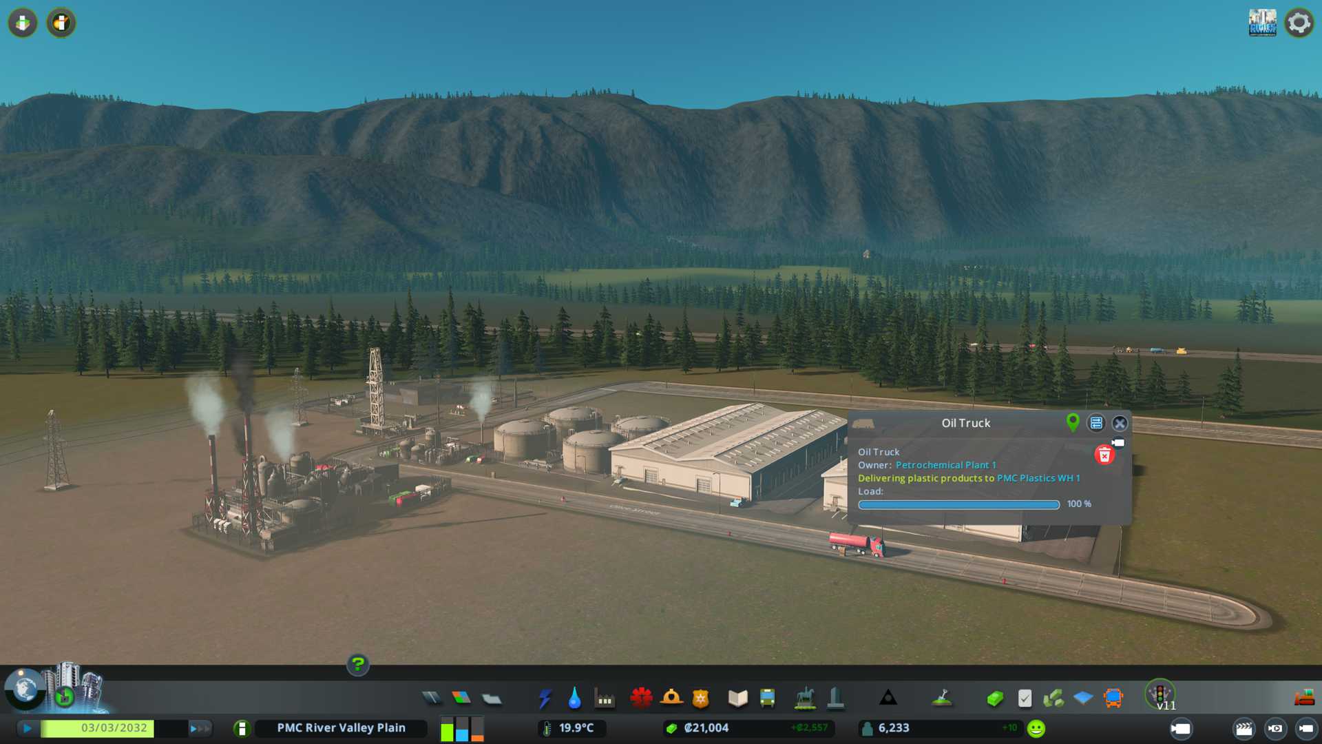 While typing those few paragraphs above, shit hit the fan in-game. Looks like PMC Oil 1 industry district petrochemical plants ran out of raw materials, the two oil pumps cannot keep up, small crude oil tank farm is empty (8t left). Okay, time to add more oil drills / pumps.