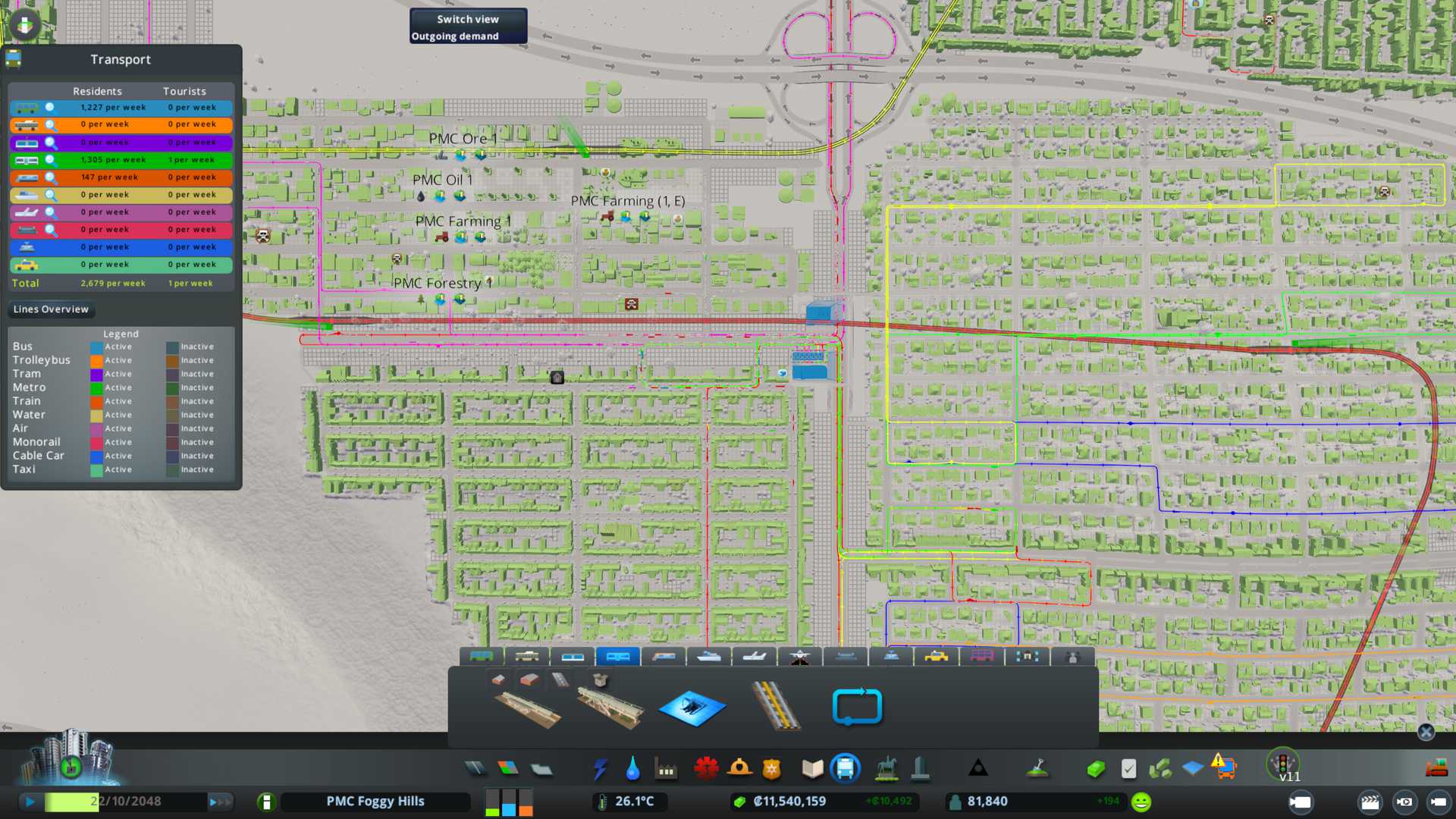 Now zoned PMC Oil 1 district with industry and our industry are complete, farming, forestry, oil and ore. Only 30u * 10u road grid zoning, not too much because afraid of getting too much semi-truck traffic.
