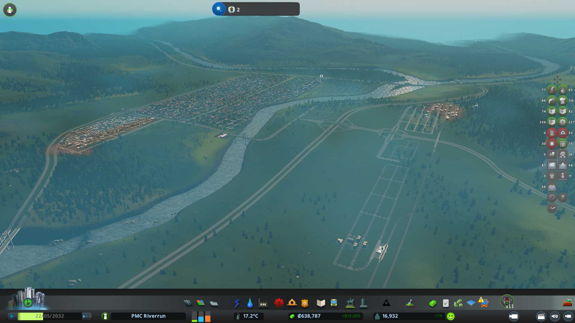Created passenger train station and cargo train terminal. Also did huge expansion over the highway, including industrial area which is near the cargo train terminal. Only question now is, will this cargo train terminal send semi-trucks deliveries to the original industrial area which might cause bad traffic issues. We'll see.