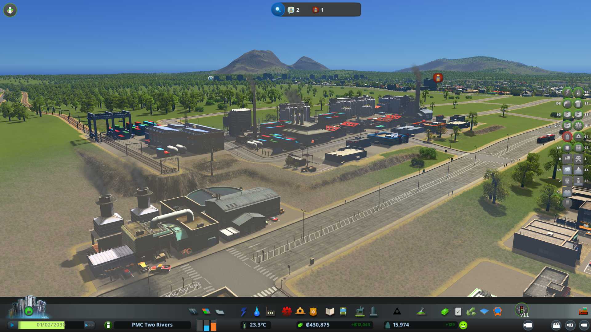 2022-09-11T13:57:00Z Finished creating bus lines for residential to industrial and residential collector, then banned all private cars from industrial area using TM:PE and finally did pedestrial walking paths between residential and industrial, uuh...